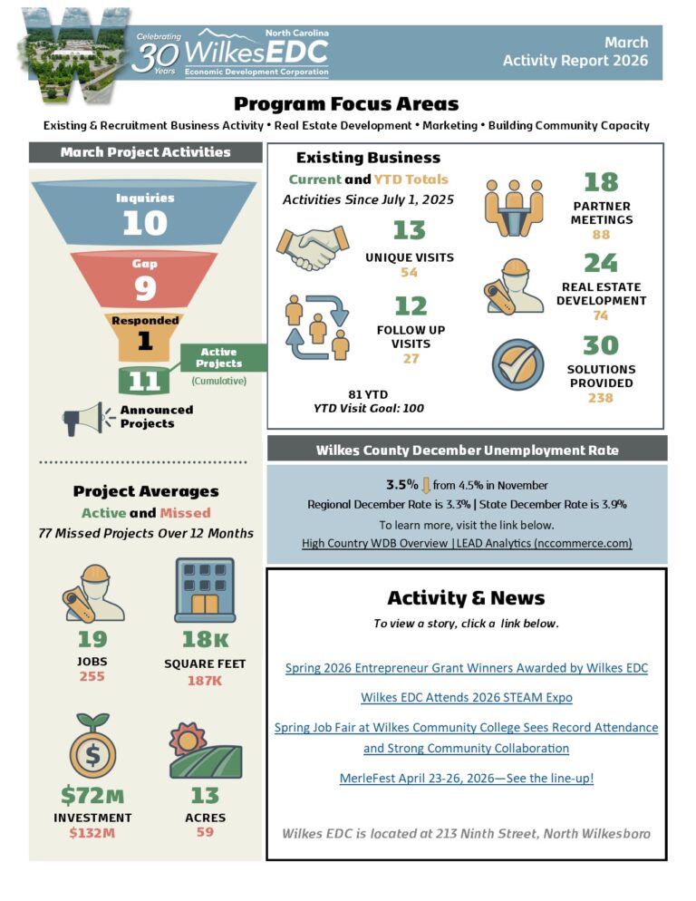Whether you’re a local business owner, aspiring entrepreneur, or community member interested in the growth of Wilkes County, our carefully curated collection of resources is here to serve you. Explore reports, studies, and news on Wilkes County’s growth, enriched with informative videos. Dive in to navigate economic complexities and stay updated on our community’s progress.